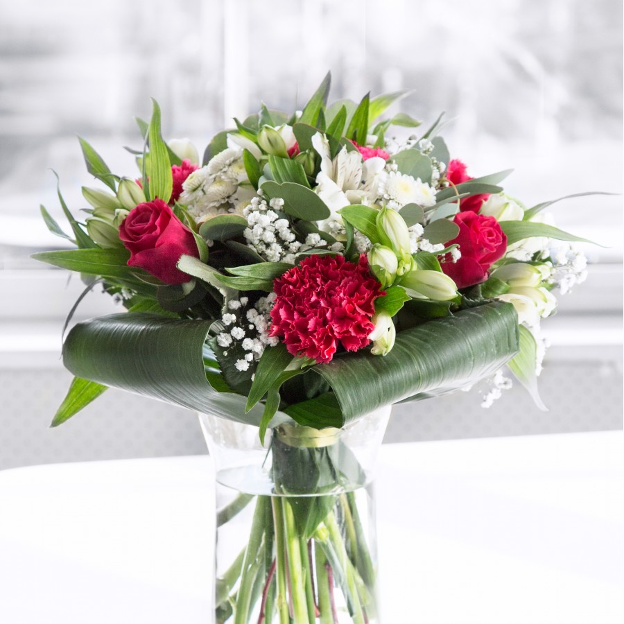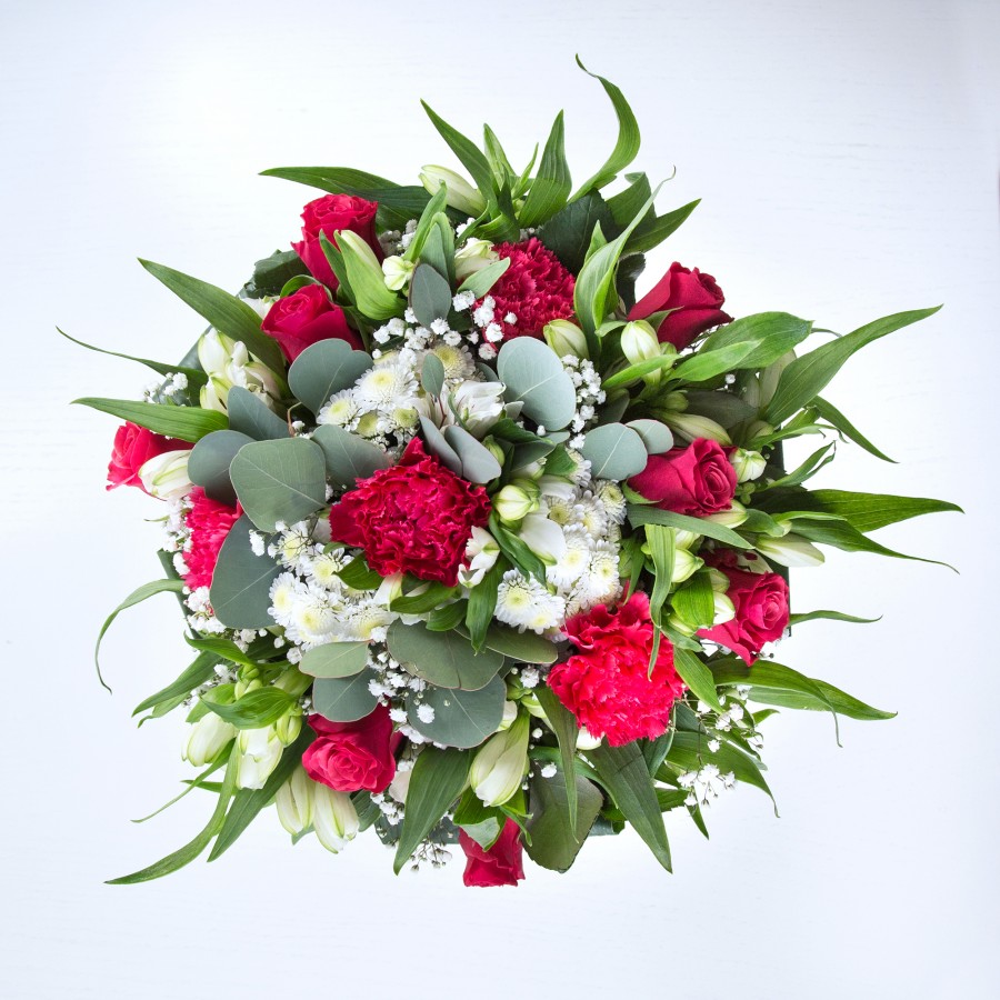 Our Timeless Beauty bouquet is a celebration of refined elegance and unique design. Featuring luxurious red roses and carnations intertwined with sweet white chrysanthemums and gypsophila, this arrangement is accented with pristine white alstroemeria and rich aspidistra leaves for a truly captivating display.